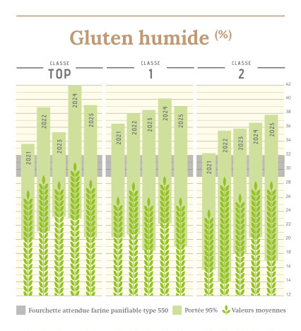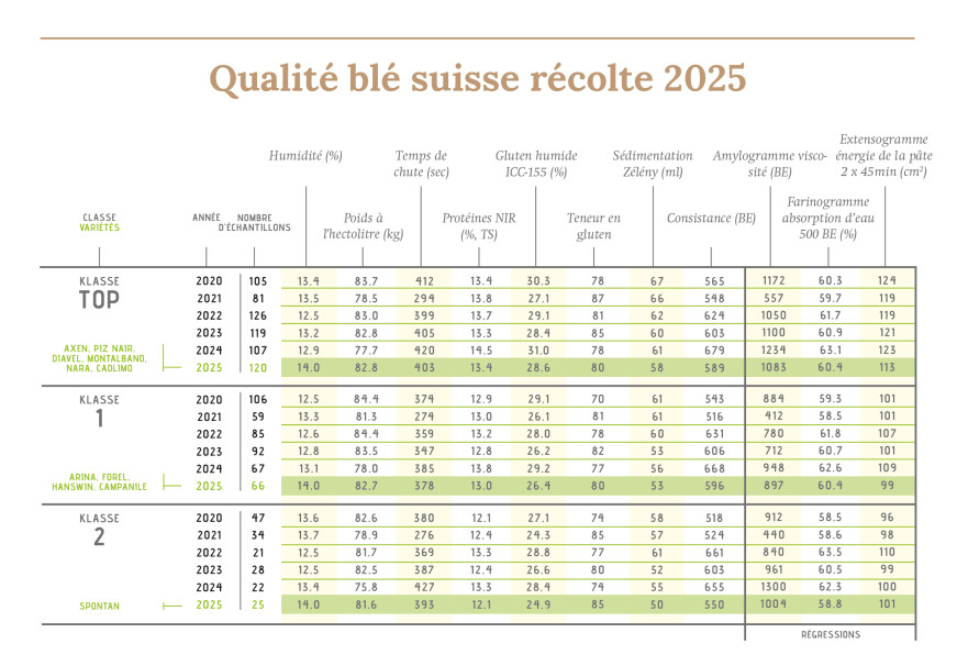 La Journée de la qualité de swiss granum a eu lieu à Berne le 18.11.2025. 403 400 t de céréales panifiables ont été récoltées, soit 77% de plus qu'en 2024 (récolte la plus basse des 25 dernières années) et 26% de plus qu'en moyenne sur les cinq dernières années. Cette année, la part de blé atteint 65,3% pour la classe TOP, ce qui représente une nouvelle augmentation au détriment des classes I (23,6%) et II (10,6%). Compte tenu des stocks disponibles au 01.07.2025, la récolte de céréales panifiables 2025 affiche un solde positif d'env. 101 800 t. Le niveau de contamination du blé meunier par des mycotoxines est faible cette année. Pour ce qui est de la qualité, les variétés de blé présentent de bons poids à l'hectolitre. Par contre, les teneurs en protéines et en gluten humide sont inférieures à celles de 2024.