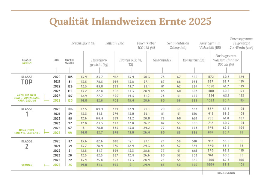 Proteinkomplex: Anhang 1 zeigt den Vergleich der Ernten 2021–2025 in Relation zu den mit den Standardkunden vereinbarten Spezifikationswerten anhand der wichtigsten Qualitätsmerkmale von Weizen. Im Gegensatz zur Erntequalität, die sich naturgemäss bei allen Merkmalen von Ernte zu Ernte ändern kann, bleiben die jeweiligen Sollbereiche über die Jahre hinweg gleich, da die Bäckereien eine konstante Mehlqualität fordern.